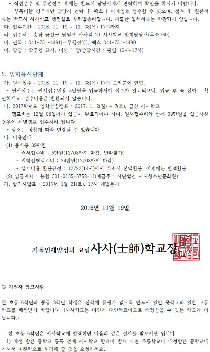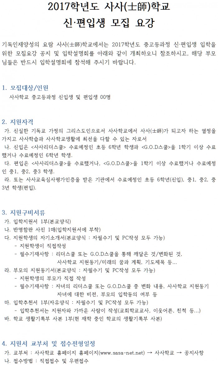 2017학년도 사사(士師)학교 신·편입생 모집 요강