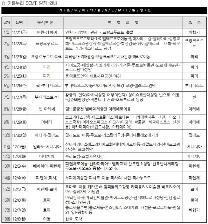 이번 가온누리 파송 SEMT는 11월 21일(금)-12월 8일까지 17박 18일간, 유럽 7개국에서 진행됩니다.