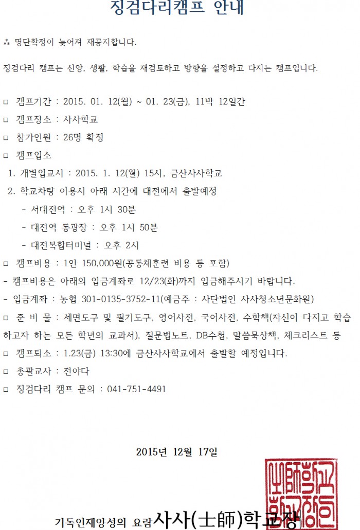 2015년 겨울 징검다리캠프 공지 페이지 정보 작성자 사사학교 작성일14-12-02 15:02 조회9,407회 댓글0건 관련링크 이전글 다음글 목록 본문 . 댓글목록 등록된 댓글이 없습니다. 이전글 다음글 목록