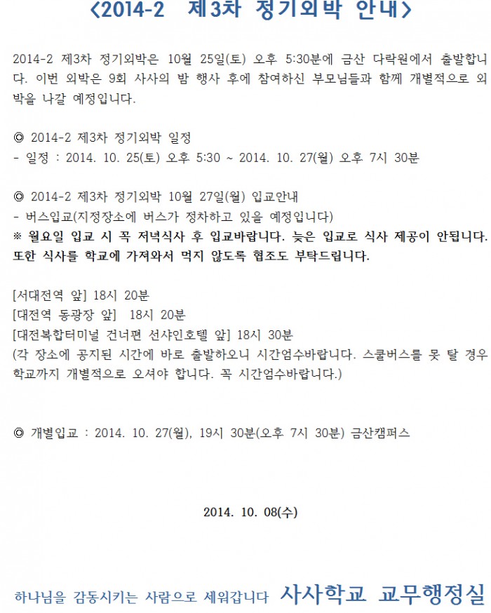 2014-2 제3차 정기외박 안내 페이지 정보 작성자 사사학교 작성일14-10-08 10:34 조회10,341회 댓글0건 관련링크 이전글 다음글 목록 본문 . 댓글목록 등록된 댓글이 없습니다. 이전글 다음글 목록
