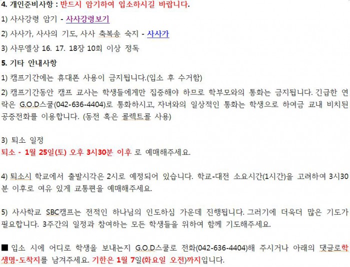 - SBC캠프 이후 G.O.D스쿨에 입학하려면, 반드시 G.O.D스쿨 부모 O.T에 참석해야 됩니다. 일정은 2월 8(토) 13시 ~ 17시까지이며 장소는 (사)사사청소년문화원입니다. (대전시 대덕구 송촌동 564-1번지 3층, 042-636-4404)