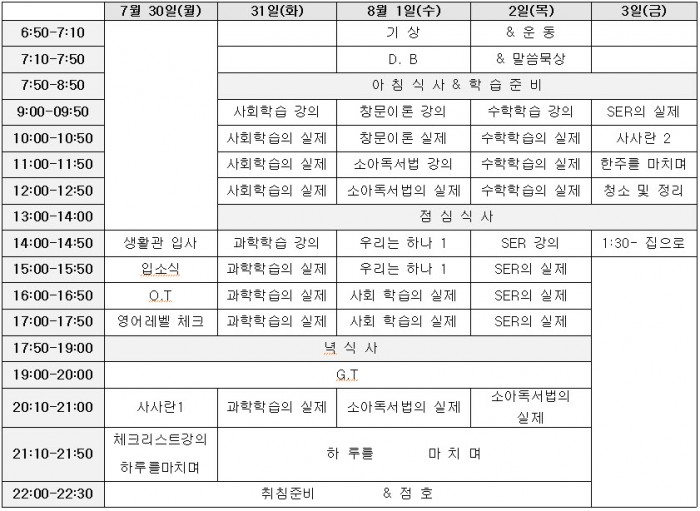 ※ 1주차 시간표(지난 15기 캠프의 시간표입니다. 캠프를 이해하기위한 참고용입니다.)