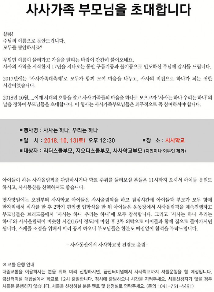 사사가족 부모님을 초대합니다 페이지 정보 작성자 사사학교 작성일18-09-26 17:09 조회8,006회 댓글0건 관련링크 이전글 다음글 목록 본문 댓글목록 등록된 댓글이 없습니다. 이전글 다음글 목록