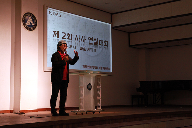 이번 사사 연설 대회는 아주 특별한 방법으로 진행되었습니다. 기존의 방법대로 사회자가 진행을 하며 참가자들을 소개하는 것이 아니라, 참가자의 멘토 선생님이 직접 나와 참가자들을 소개했습니다. 아무래도 자신의 학생을 가까이에서 관심을 가지고 지켜보신 멘토 선생님이 그 학생을 가장 잘 소개할 수 있을 테니 말입니다. 자신의 멘토 선생님께 응원을 받고 연설을 하러 나가는 참가자들의 표정도 한결 편해 보였습니다.
