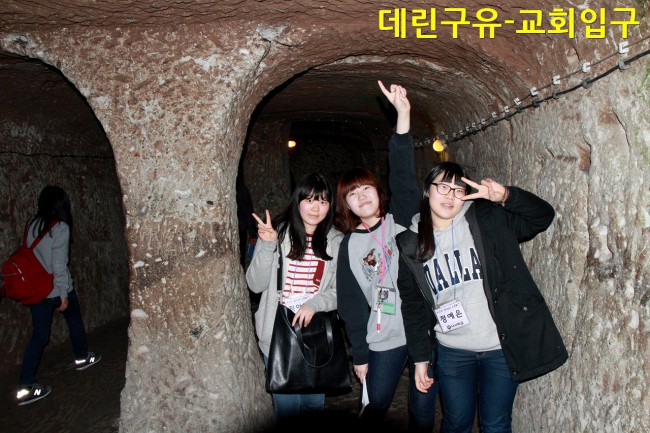 먼저, 데린구유는 그 시대에 많은 적들이 쳐들어오고 기독교의 박해가 심해지자 우리의 믿음의 선배들은 신앙을 지키기 위해 땅을 파서 도시를 만들고 위험할 때 숨어서 지내던 지하도시였는데 직접 들어가보니 정말 좁고 낮았습니다. 만약 적이 쳐들어왔다면 좀 힘들었을 것 같다는 생각을 했습니다. 그런데도 더 놀라운 건 지상으로 통풍구멍을 내어서 신선한 공기를 마실 수 있고 지하인데도 냄새도 나지 않고 춥지도 않고 상쾌한 기분인 들었고 믿음의 선배들은 정말 지혜롭고 머리가 정말 좋았던 것 같습니다. 가이드 선생님께서 데린구유는 엄청 넓고 깊게 다른 마을들과도 이어져 있지만 발굴이 안되었다고 하셨습니다. 저는 데린구유에서 머리를 몇 번 부딪혔는데 정말 아팠습니다. 허리는 폴더처럼 90도로 꺾여 다녀야 했습니다. 우리나라가 종교의 자유가 있고 학교, 교회가 있다는 게 감사한 순간이었습니다.