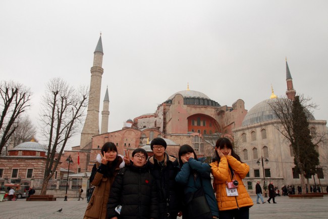 내부는 정말 신전에서 가져온 기둥으로 모든 기둥을 세웠고 둥근 곳에 천장은 기독교의 모자이크나 벽화들이 이슬람의 아랍어로 무언가 쓰여있는 걸로 덮여 있었고 조명과 글자들이 모스크처럼 되어있어 기분이 나쁘면서 예수님의 관한 벽화들이 회칠로 덮여 있어서 화가났지만 참았습니다. 정말 그대로 보존되었다면 현 시대의 최고의 성당이며 기독교의 중요한 요새였을 거라고 생각을 해보았습니다. 지금도 하기아 소피아 성당은 들어올때도 몇사람이 피켓을 들고 시위하듯이 이슬람땅의 모스크를 모스크로만 이용하지 왜 공개를 하느냐고 시위를 하고 있는 것처럼 많은 이슬람들이 이런 생각을 가지고 있고 반면에 우리 기독교인들과 많은 전세계의 사람들은 기독교의 유물이니 원형을 보존하고 더 많은 사람들이 볼 수 있게 해야한다는 입장으로 이 성당은 이슬람교와 기독교 대립이 가장 큰 곳 중에 하나입니다. 우리 G.O.D School은 그 곳에서 기도를 드렸습니다. “하나님~! 이 소피아성당을 주님을 예배하는 교회로 바꾸어 주시옵소서”라고 나도 간절히 기도하며 내부의 벽화들을 보며 기도하며 성당을 나왔습니다.