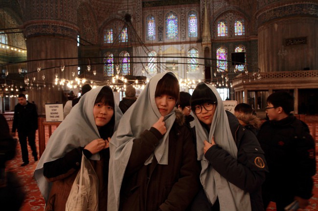 우리가 이곳에 도착한 시간은 3시 30분, 아직 30분이 남아서 디코선생님의 남은 이슬람의 이모저모의 이야기를 들었습니다. 이슬람은 여자를 우습게 여기며 터키는 많이 좋아 졌고 이란과 사우디 아라비아는 2000년이 넘어서야 여자도 주민등록증을 발급했다는 사실에 정말 놀랐습니다. 정말 우리나라에 사는 기가센 여자들이 이 곳에 와서 회개를 했으면 좋겠다는 생각이 들었습니다(하하하) 그래서 모스크에도 여자들이 기도할 수 있는 곳은 제일 뒤쪽에 정해진 구역에서만 기도를 할 수 있다고 하셨고 이슬람의 다섯 기둥처럼 우리도 하나님을 향한 다섯기둥을 세우고 또 하루에 5번 시간을 정해서 기도했으면 좋겠다고 하셨는데 정말 마음에 와 닿았습니다. 저도 오늘부터 하나님을 향한 나의 5가지의 큰 계획을 세우고 하루에 5번 시간을 정하여 기도하도록 노력하기로 했습니다. 어느새 시간이 되어 모스크로 들어 갈 수 있었습니다.