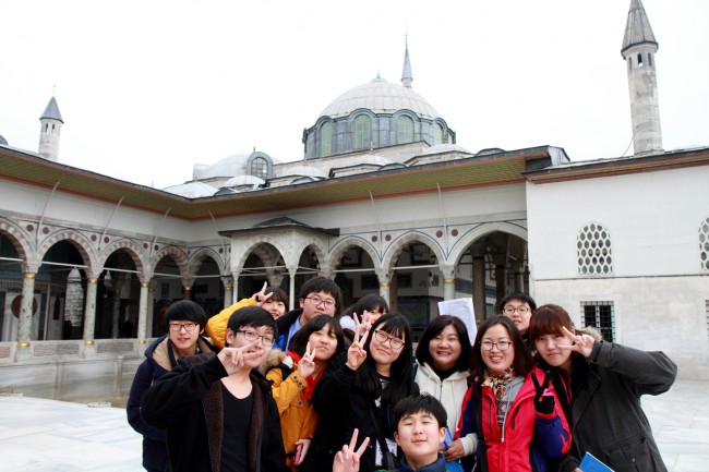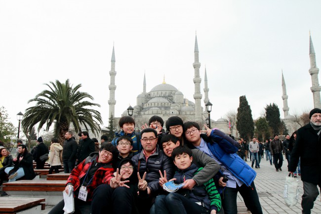 들어가는 도중 모든 사람들은 비닐에다 신발을 넣어서 맨발로 가야하고 역시 여자들은 머리에 히잡(이슬람교에서 여자들이 머리를 보자기나 스카프로 가리는 것)을 써야 한다고 해서 모든 관광객들도 히잡을 쓰고 모스크로 들어갔습니다. 역시나 크기는 웅장했지만 웅장한 천장에서 위험하게 엄청나게 큰 조명들이 우리 머리위까지 있어 위험해 보였고 하기아 소피아 성당 천장에서 보았던 문양들을 여기서도 볼 수 있었고 뒷부분에는 여자들만 들어가는 경계선이 있었습니다. 카페트는 사람들이 줄을 맞춰 기도 할 수 있도록 줄이 그어져 있있고 중간에는 10명정도 따로 기도하는 공간이 있었습니다. 디코선생님이 강의 할 때 모스크에는 우리 교회처럼 목사님이 없고 그 마을이나 모스크에 연장자 중에서 코란(이슬람교에서 우리 기독교에 성경과 같은 책)을 많이 알고 읽은 사람을 “이맘”으로 지정하여 하루 5번의 기도를 인도하고 가끔 설교같은 강연을 한다고 하셨는데 오늘 마침 “이맘”이 사람들을 모아놓고 강연을 하고 있어서 신기하면서도 이 곳이 교회이고 이맘이 목사이고 저들이 우리와 같은 하나님의 신자였으면 하는 마음이 들면서 자연스럽게 기도가 나왔습니다. 아마도 대부분의 사사리더,빌더들이 기도 했을 거라고 생각합니다. 우리는 이슬람의 실체와 모스크의 실체를 알고 모스크를 나왔습니다. 무거운 마음으로 모스크를 나왔는데 나의 무거운 마음을 가볍게 만드는 사람들이 있었습니다. 여자들은 히잡을 써야하는데 후드티의 모자나 잠바의 모자를 써도 되어서 여자3명외에는 다 모자를 썼습니다. 하지만 3명은 히잡을 쓰고 나와서 모두들 웃으며 모스크를 나올 수 있었지만 우리들의 마음 한 곳에 무거운짐은 그대로 있었습니다.