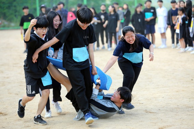 그러나 체육대회를 하는 동안 날씨가 너무 더운 탓에 힘든 부분도 있었지만, 그럼에도 학생들은 포기하거나 힘들어하는 내색을 하지 않고 끝까지 조원들과 함께 체육대회를 해나갔습니다. 체육대회동안 여러가지 게임들을 하며 진 팀도 있고, 이긴 팀도 있었지만 모두 승패에 상관없이 즐거운 시간을 보내며 조원들과 더 하나가되며 행복할 수 있던 시간이 되었습니다.