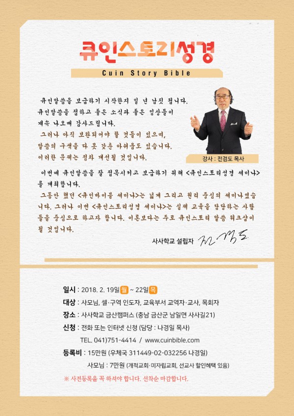 너무나 많은 분들의 요청이 있어서 큐인스토리성경 세미나가 이번 2월19일~22일까지 사사학교에서 있습니다. 이번에는 큐인 말씀을 스토리로 가정과 교회에 접목되는 아주 쉽고 재미있게 하는 워크샵 세미나입니다. 각 교회 사모님, 파트 부모교역자 ,셀 인도자, 교회학교 교사, 부모 위주로 모집 대상이 되어 접목이 쉽게 진행될 것이므로 우리 부모님들은 모두 참석하시어 큐인 말씀 묵상의 위력을 경험해 보시기 바라며 주위 분들에게도 꼭 함께 오시도록 권유하시면 모두 좋아하실 것입니다