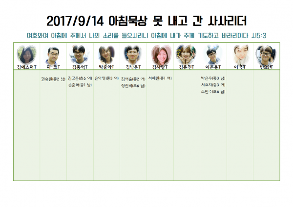 9/14 아침말묵 안 보내고 간 사사리더 페이지 정보 작성자 GOD (121.♡.151.27) 작성일17-09-14 12:31 조회7,156회 댓글1건 관련링크 이전글 다음글 목록 본문 댓글목록 김낙운님의 댓글 김낙운 아이피 121.♡.151.27 작성일 17-09-15 11:45 정진석 아침에 말씀묵상 했습니다. 김여울 학교에서 야영갔습니다. 정진석 아침에 말씀묵상 했습니다. 김여울 학교에서 야영갔습니다. 이전글 다음글 목록