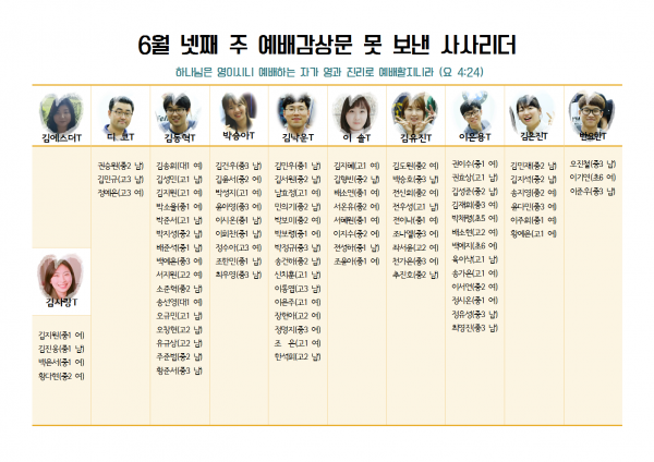 6월 넷째 주 예배감상문 안 보낸 사사리더 페이지 정보 작성자 GOD (112.♡.33.138) 작성일17-06-27 20:09 조회3,575회 댓글0건 관련링크 이전글 다음글 목록 본문 댓글목록 등록된 댓글이 없습니다. 이전글 다음글 목록
