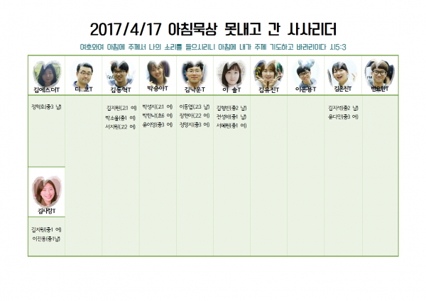 4/17 아침말묵 안 보내고 간 사사리더 페이지 정보 작성자 GOD (112.♡.33.138) 작성일17-04-18 14:33 조회6,931회 댓글1건 관련링크 이전글 다음글 목록 본문 . 댓글목록 GOD님의 댓글 GOD 아이피 112.♡.33.138 작성일 17-04-21 11:07 박한나(초6) 아침말묵 했습니다. 박한나(초6) 아침말묵 했습니다. 이전글 다음글 목록