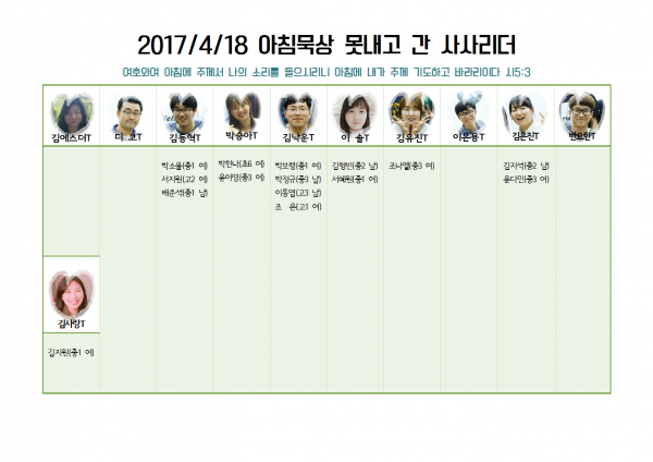 4/18 아침말묵 안 보내고 간 사사리더 페이지 정보 작성자 GOD (112.♡.33.138) 작성일17-04-19 14:38 조회6,982회 댓글1건 관련링크 이전글 다음글 목록 본문 . 댓글목록 GOD님의 댓글 GOD 아이피 112.♡.33.138 작성일 17-04-21 11:07 박한나(초6) 아침말묵 했습니다! 박한나(초6) 아침말묵 했습니다! 이전글 다음글 목록