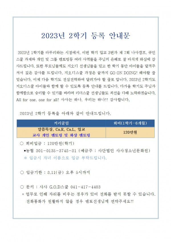 2023-2학기 G.O.D 스쿨 등록 안내문 페이지 정보 작성자 GOD (119.♡.39.2) 작성일23-08-07 14:48 조회1,155회 댓글0건 관련링크 이전글 다음글 목록 본문 위의 이미지를 클릭 시 크고 선명하게 보실 수 있습니다. 댓글목록 등록된 댓글이 없습니다. 이전글 다음글 목록