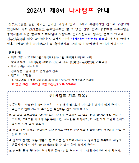 2024년 제8회 나사캠프 1차 공지 페이지 정보 작성자 관리자 (119.♡.39.2) 작성일23-11-29 15:35 조회957회 댓글0건 관련링크 이전글 다음글 목록 본문 댓글목록 등록된 댓글이 없습니다. 이전글 다음글 목록