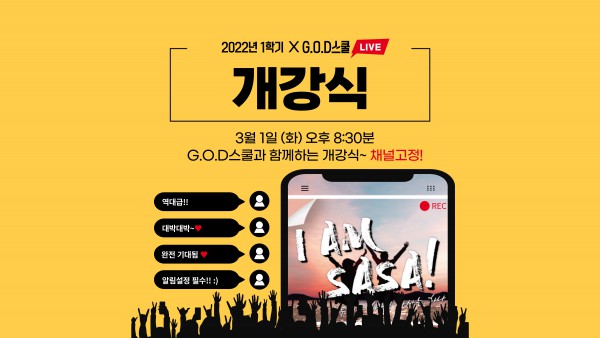 2022-1학기 G.O.D 스쿨 개강식 안내! 페이지 정보 작성자 GOD (211.♡.223.112) 작성일22-02-24 15:19 조회1,734회 댓글0건 관련링크 이전글 다음글 목록 본문 3월 1일 (화) 오후 8시 30분, 유튜브에서 사사학교를 검색해서 실시간 방송을 시청하면 됩니다. 댓글목록 등록된 댓글이 없습니다. 이전글 다음글 목록