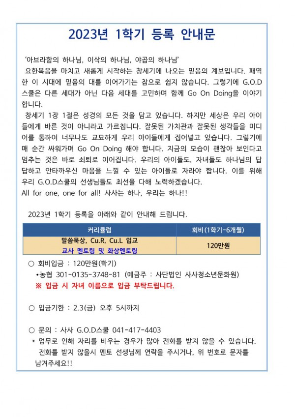 2023년 1학기 G.O.D스쿨 등록 안내 페이지 정보 작성자 GOD (211.♡.223.112) 작성일23-01-13 11:53 조회1,499회 댓글0건 관련링크 이전글 다음글 목록 본문 ※ 이미지를 클릭하시면 더욱 선명하게 보실 수 있습니다. 댓글목록 등록된 댓글이 없습니다. 이전글 다음글 목록