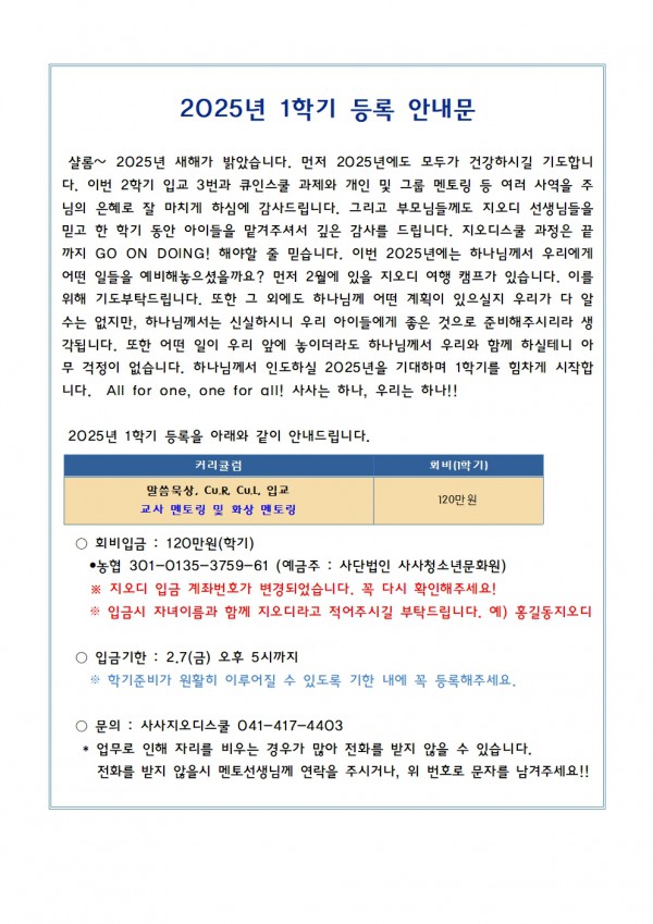 2025년 1학기 지오디스쿨 등록공지 페이지 정보 작성자 GOD (119.♡.39.2) 작성일25-01-24 17:41 조회298회 댓글0건 관련링크 이전글 다음글 목록 본문 _ 댓글목록 등록된 댓글이 없습니다. 이전글 다음글 목록