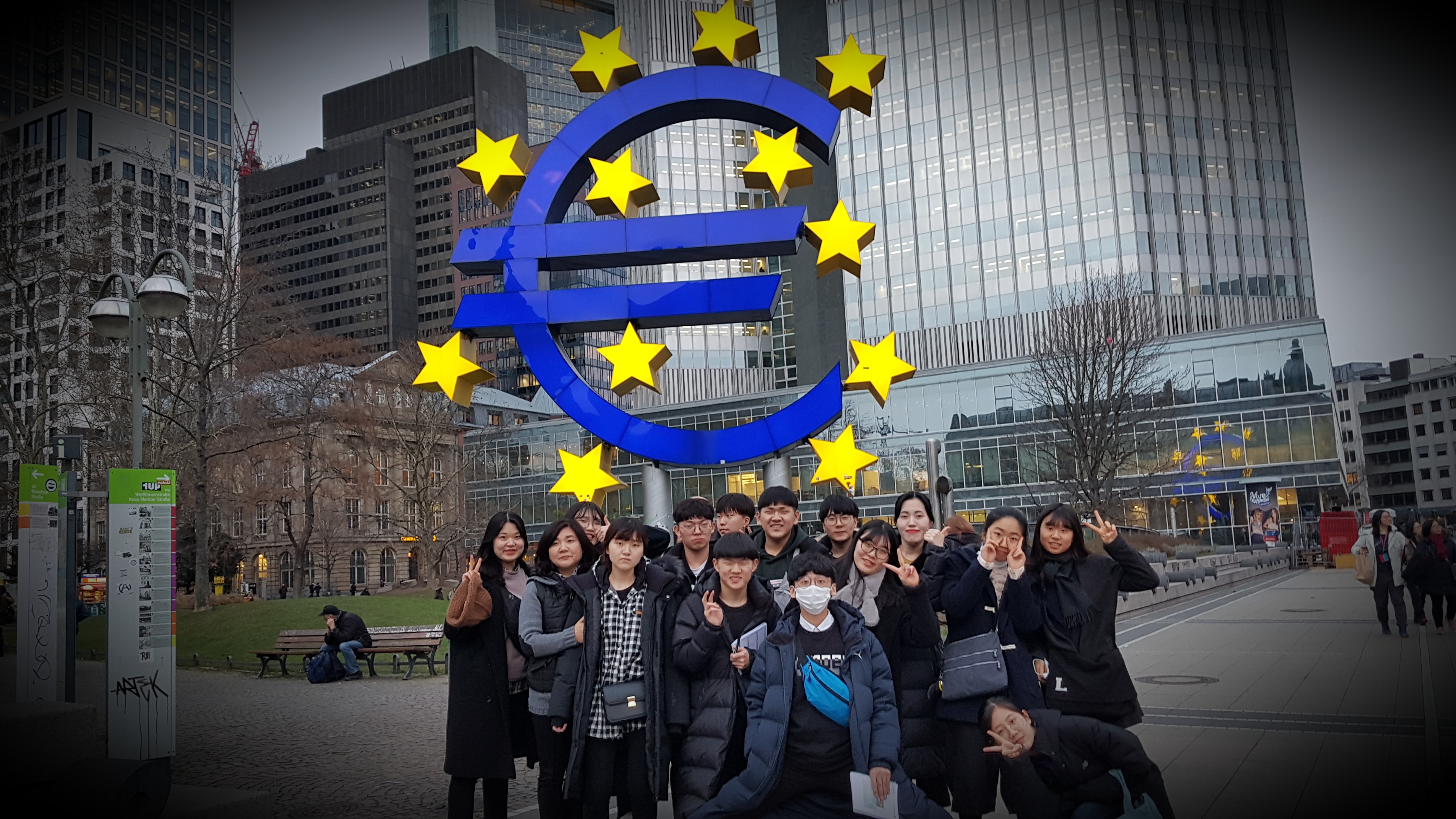 유럽금융의 중심지에 도착하여 설명을 듣고 우리는 커다란 유로동상앞에서 사진을 찍고